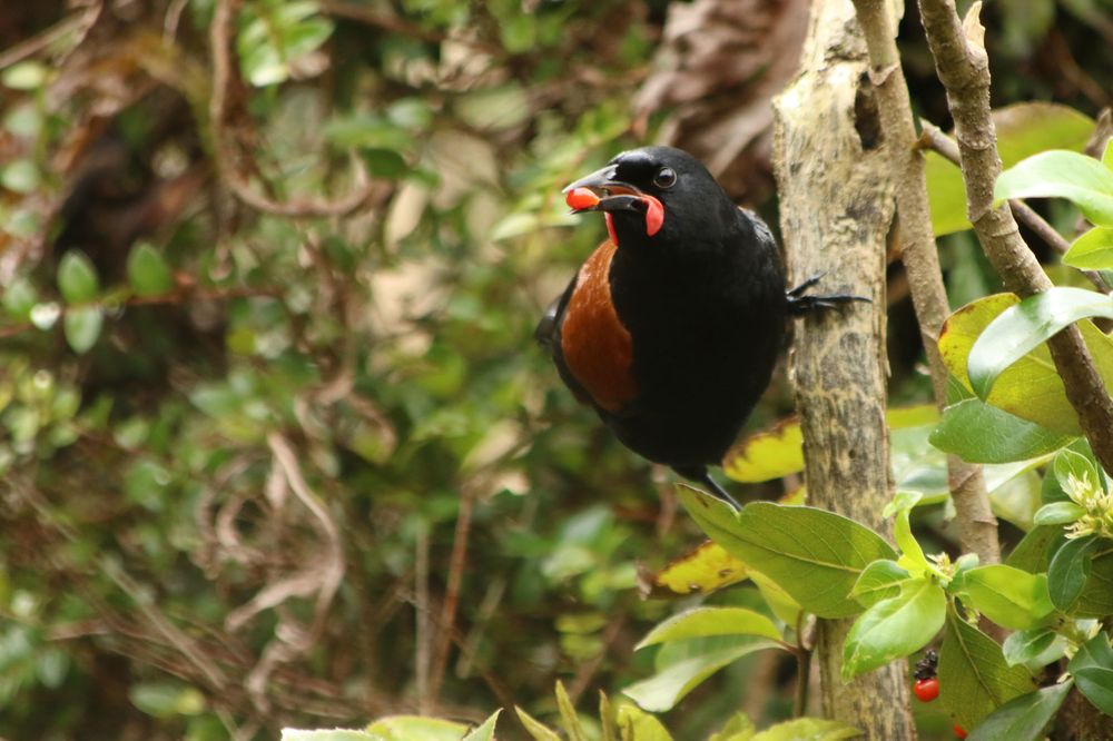 Watching the saddleback feed is always an entertaining experience! With berries flying everywhere, excited birds flit around not sitting still for a second, looking for the best treat. Straight after this photo was taken, the female came and the male fed her all the berries he had just seemingly collected for himself. There were many branches and leaves in the way, had I spent the time trying to get them in shot I would have missed this beautiful bonding moment between the pair.
